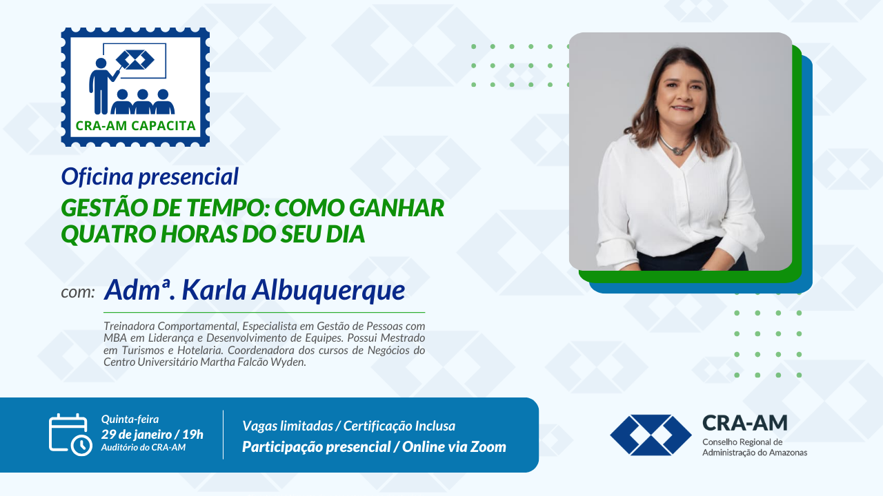 Últimas Notícias Oficina – Gestão de Tempo: Como ganhar quatro horas no seu dia A gestão do tempo é uma habilidade essencial no mundo moderno, onde as demandas e responsabilidades parecem multiplicar a cada ...Leia Mais Aqui tem vantagem! – Sorteio de Bolsas de Estudo A Campanha de pagamento da Anuidade 2026 do Conselho Regional de Administração do Amazonas / CRA-AM está a todo vapor, ...Leia Mais Parceria CRA-AM / Profissional de Administração, transforme sua carreira. Neste mês de janeiro, o Manual de Perícias abre uma excelente oportunidade para profissionais que desejam ampliar sua atuação e ...Leia Mais CRA-AM disponibiliza calendário/planner edição 2026 aos Profissionais de Administração Mais um ano começou, e o tão esperado calendário/planner do CRA-AM edição 2026 já está disponível para os profissionais, que ...Leia Mais Anuidade 2026 já está disponível para pagamento A anuidade de 2026 do Sistema CFA/CRAs já está disponível! Os valores atualizados estão na Resolução Normativa CFA N° 677, de ...Leia Mais Vamos juntos abraçar o futuro, celebrando a nossa história e construindo novos capítulos. Neste ano em que a Administração completou 60 anos de regulamentação no país, lapidamos aptidões e destacamos a preciosidade e ...Leia Mais 1 2 3 … 17 › Institucional Calendário de Eventos 29 jan CRA-AM Capacita / Oficina Gestão de Tempo Últimas Publicações Confira outras publicações